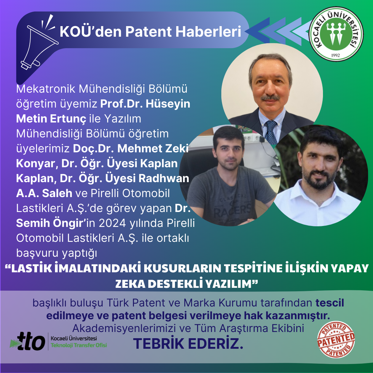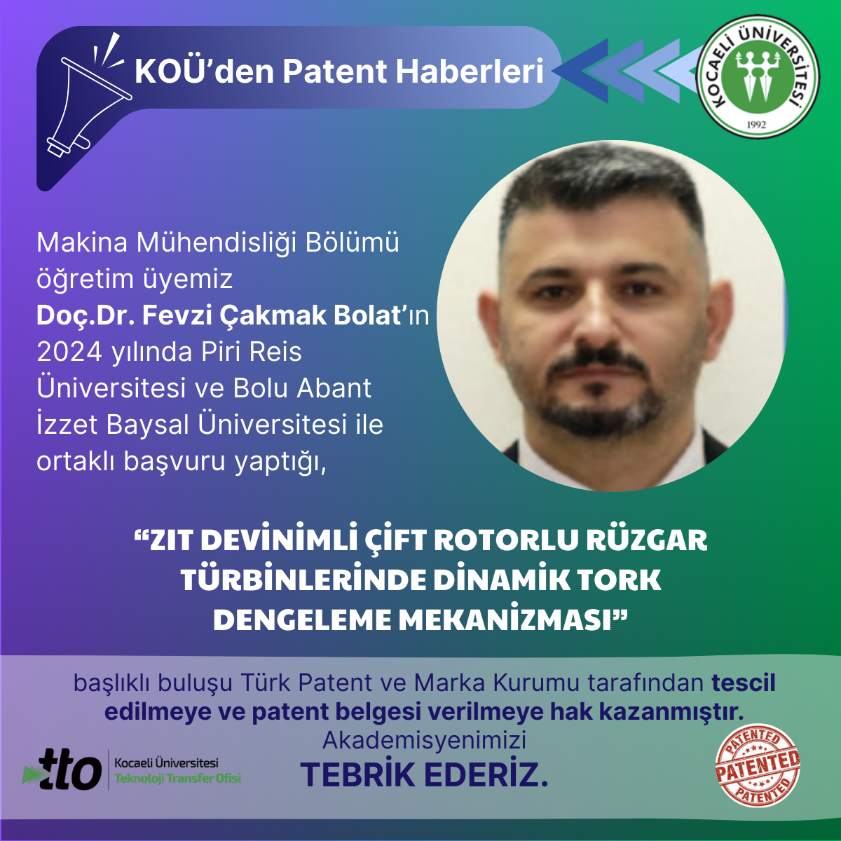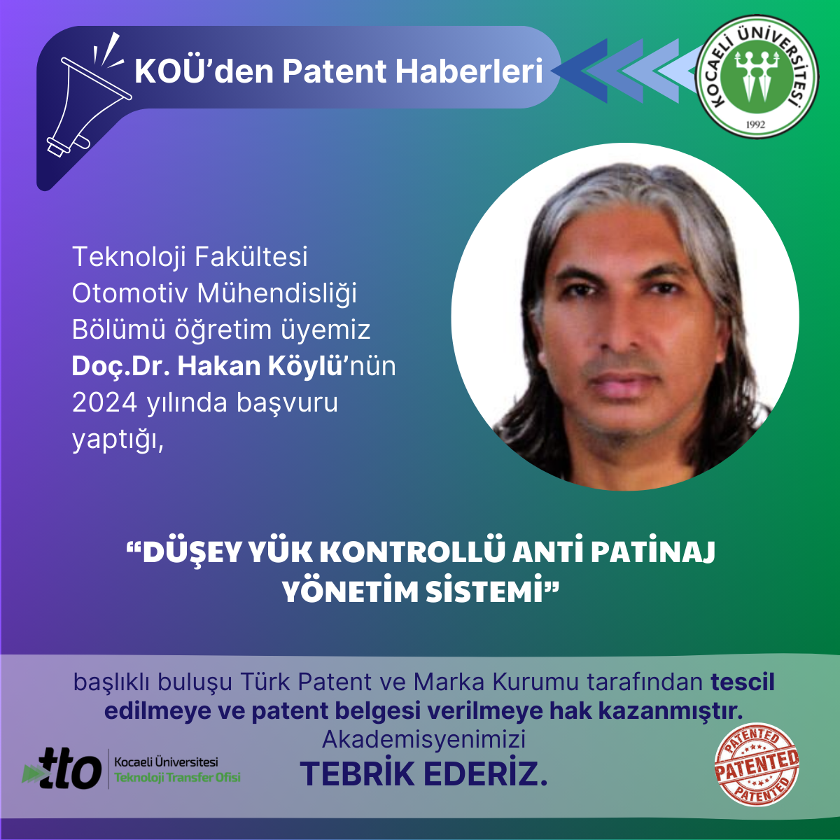 Teknoloji Fakültesi Otomotiv Mühendisliği Bölümü öğretim üyemizDoç.Dr. Hakan Köylü’nün 2024 yılında başvuru yaptığı,"DÜŞ...