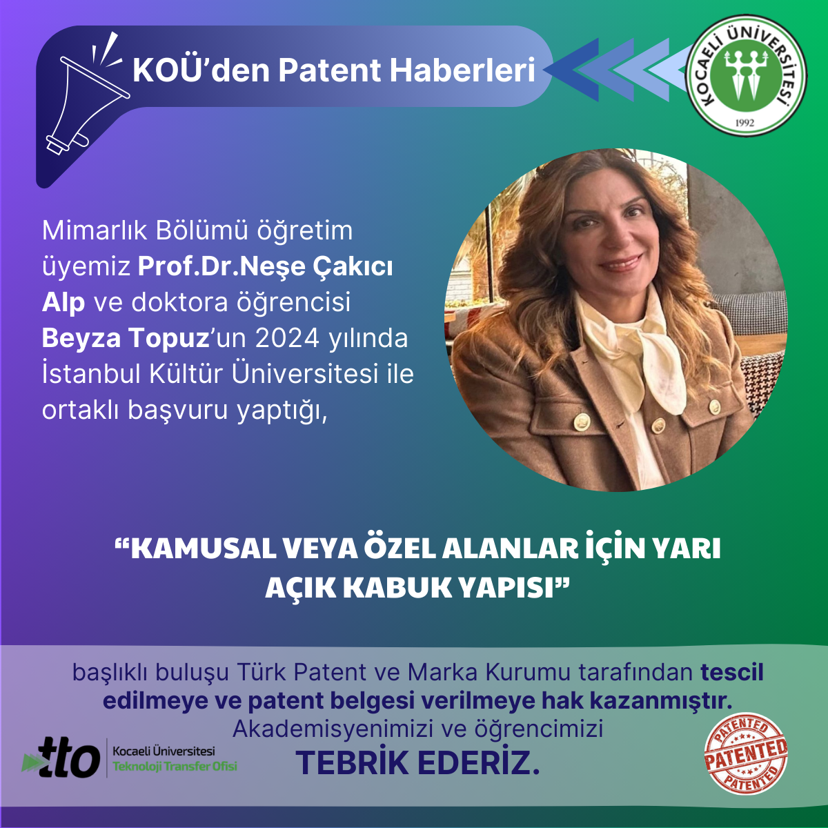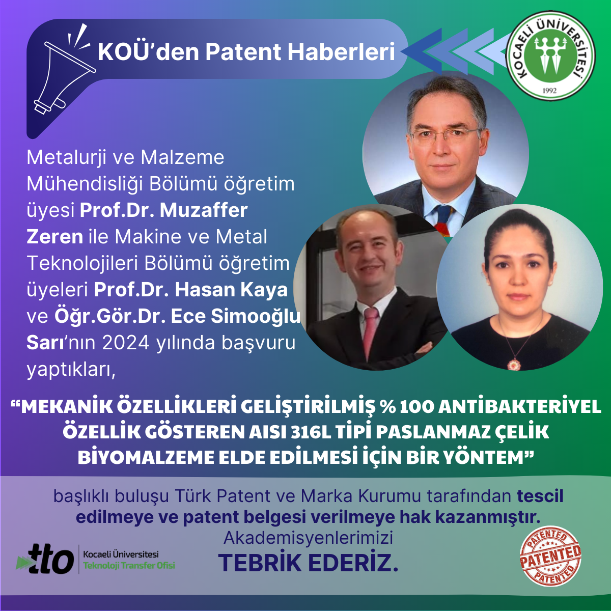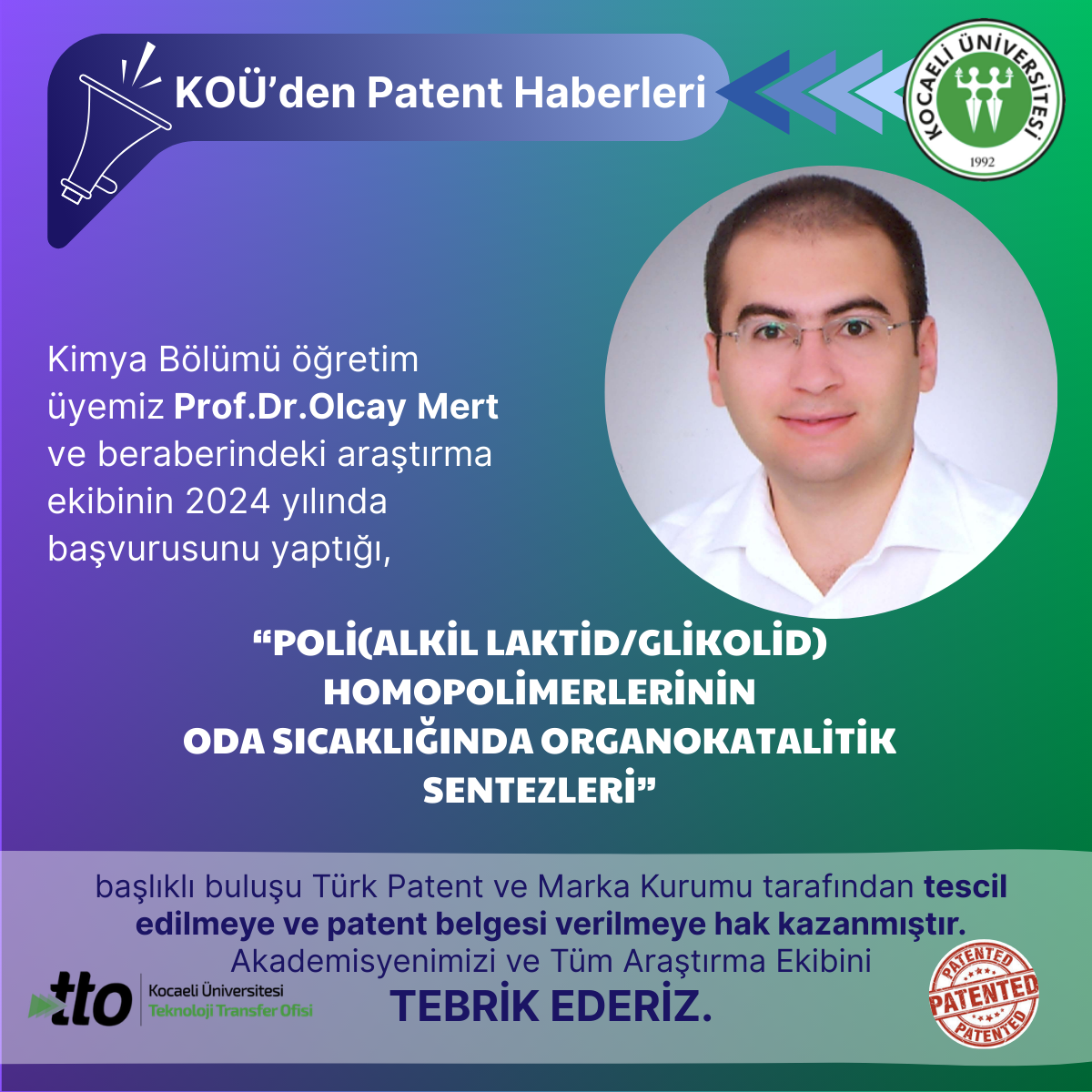 Kimya Bölümü öğretim üyemiz Prof.Dr.Olcay Mert ve beraberindeki araştırma ekibinin 2024 yılında başvurusunu yaptığı,"POL...