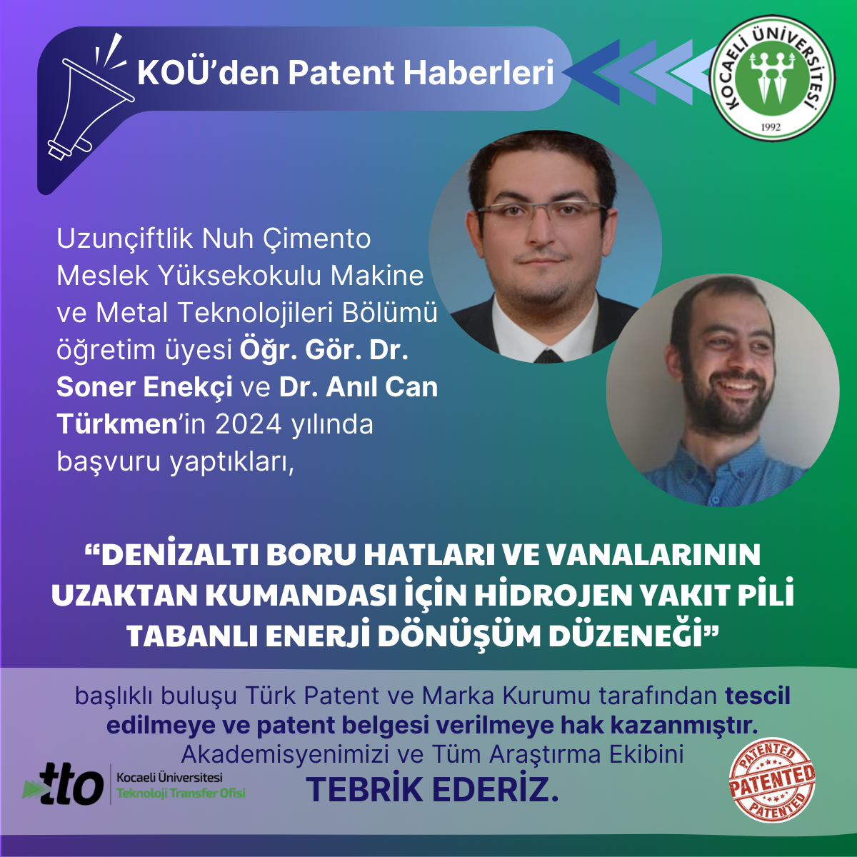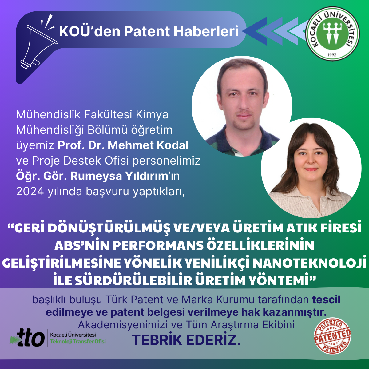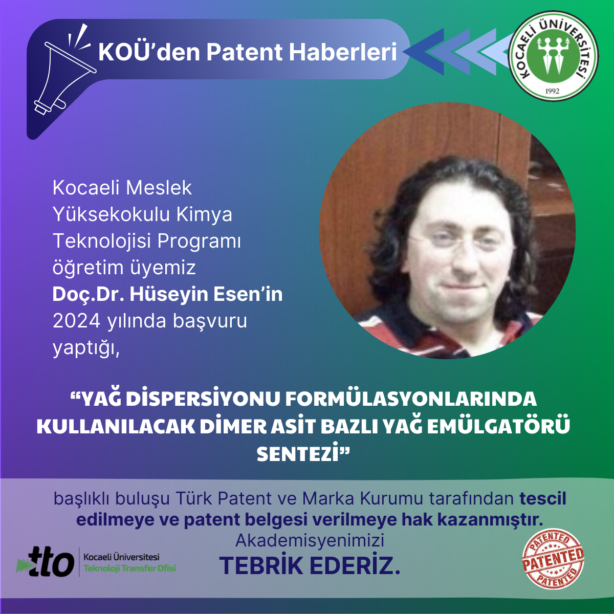 Kocaeli Meslek Yüksekokulu Kimya Teknolojisi Programı öğretim üyemiz Doç.Dr. Hüseyin Esen’in 2024 yılında başvuru yaptığ...
