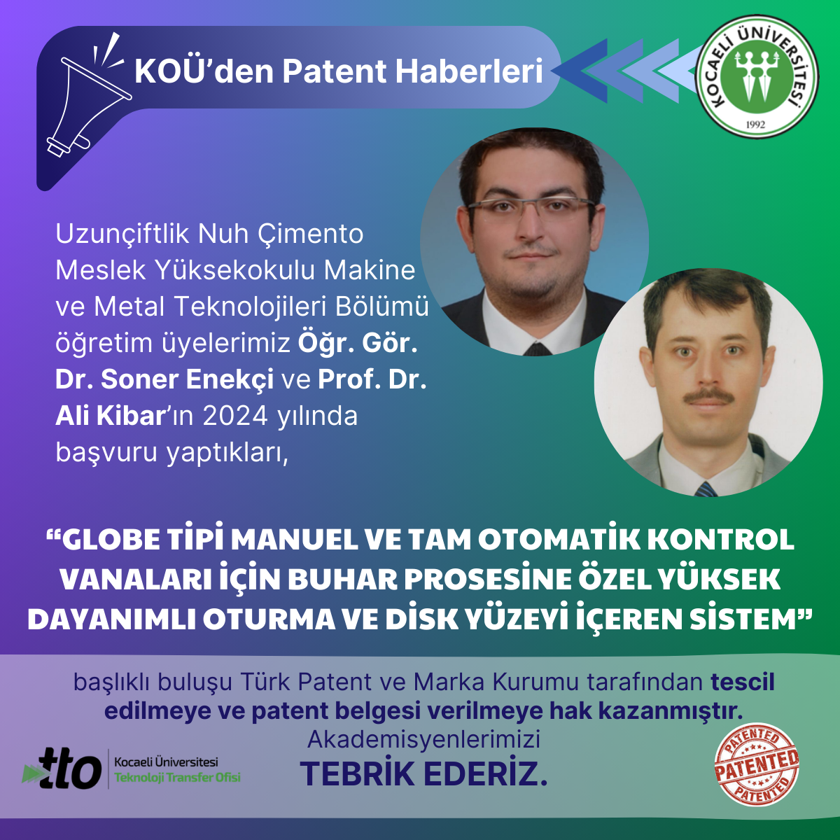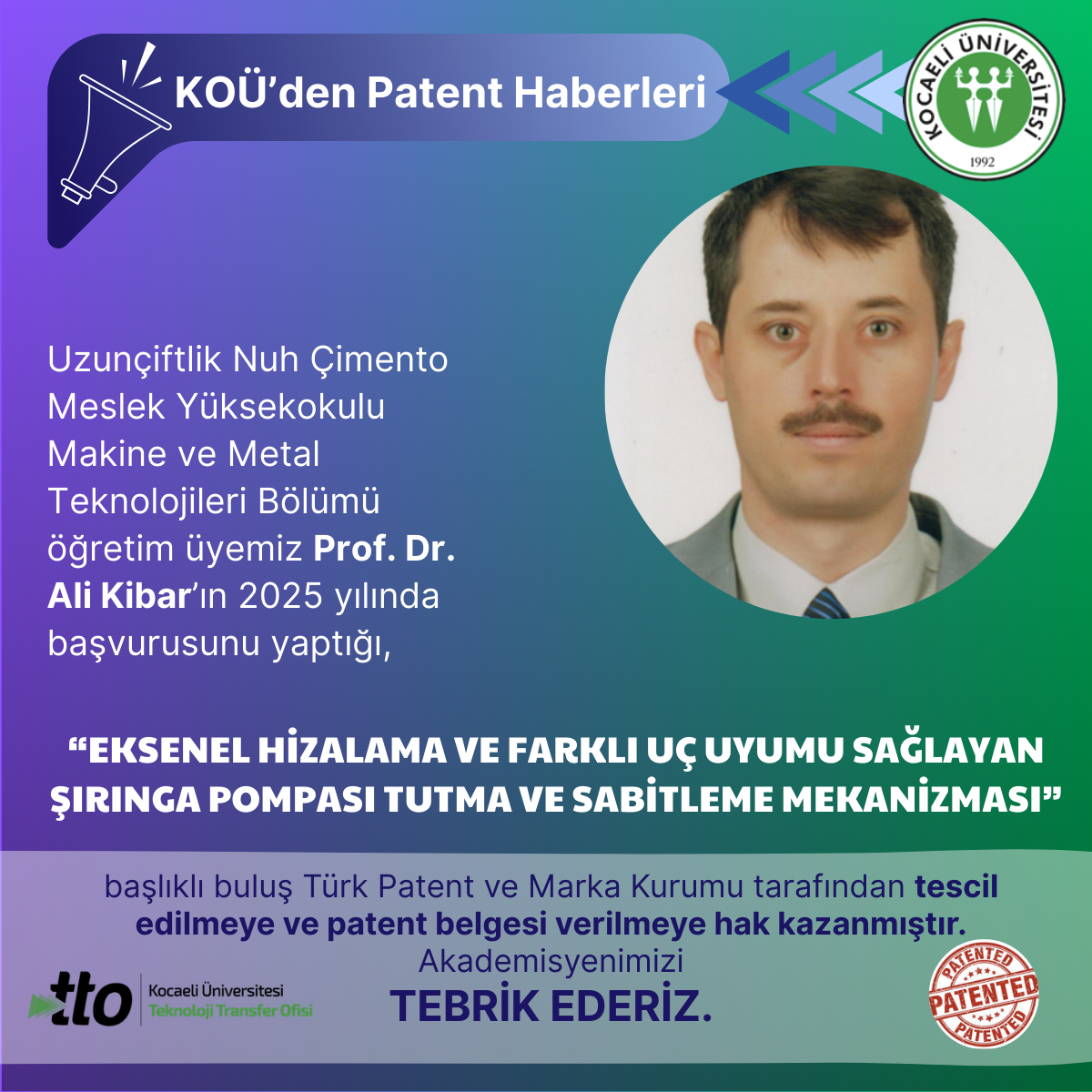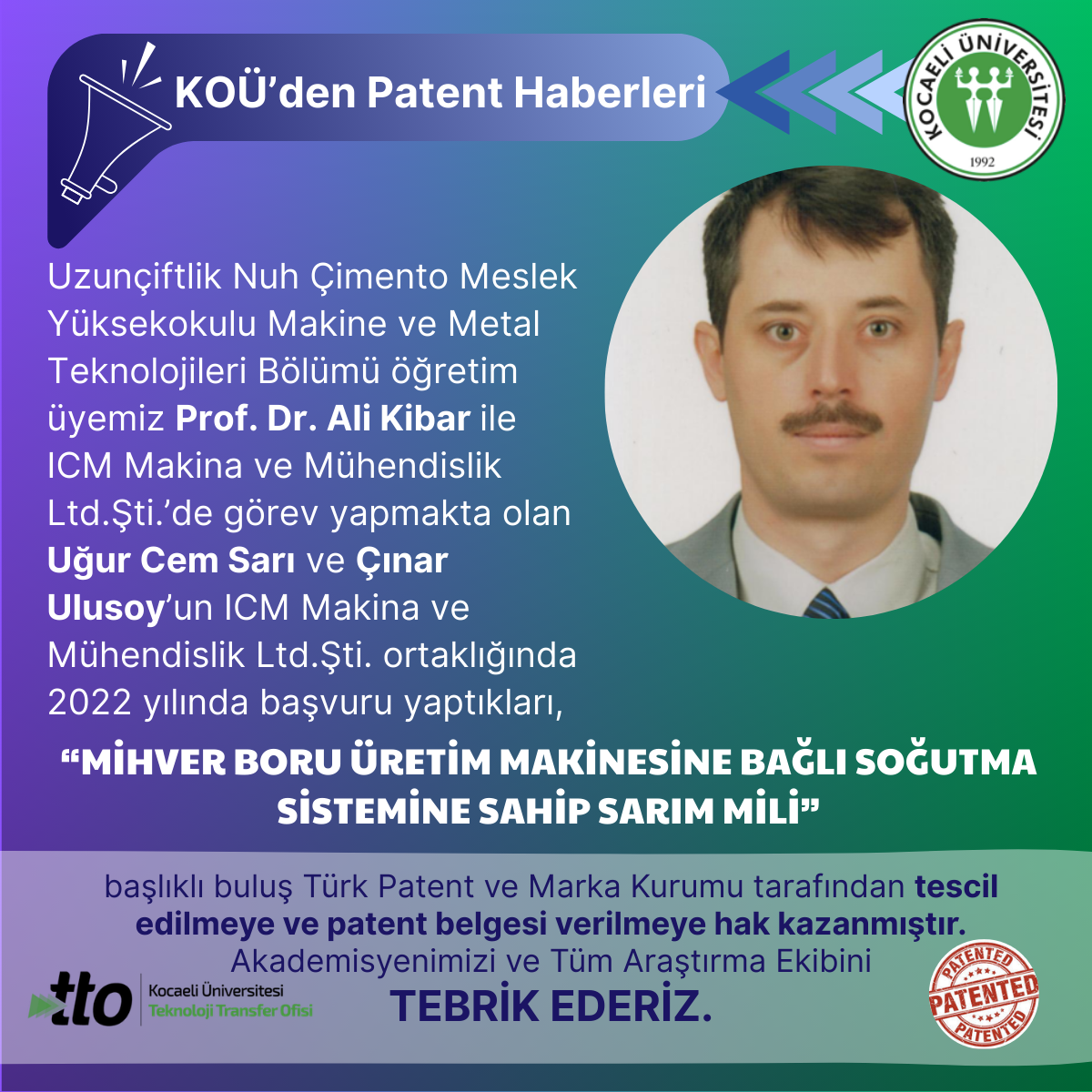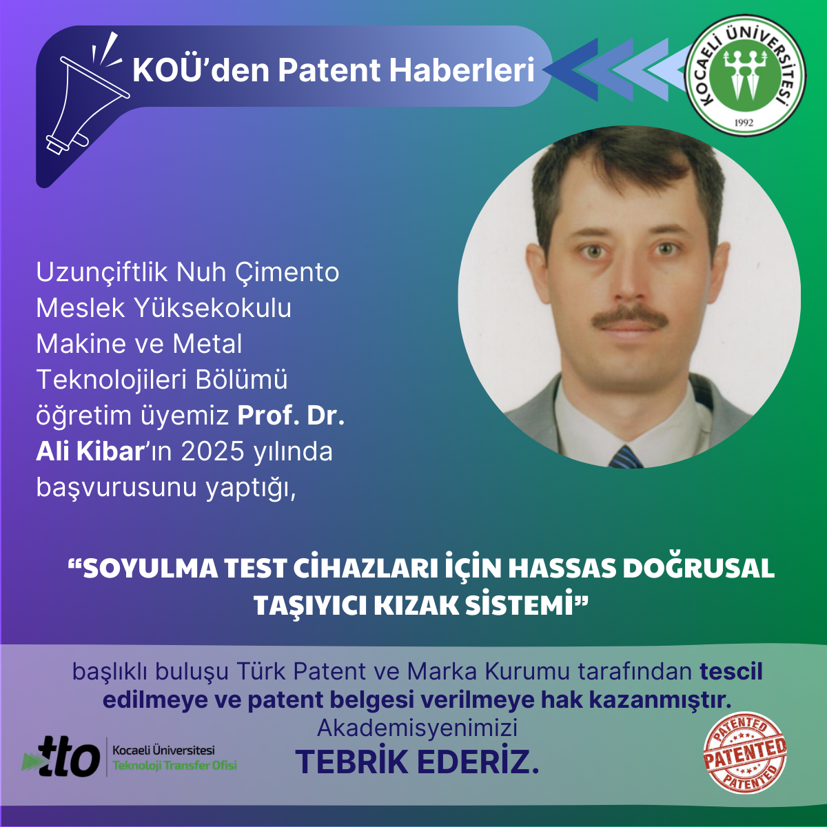 Uzunçiftlik Nuh Çimento Meslek Yüksekokulu Makine ve Metal Teknolojileri Bölümü öğretim üyemiz Prof. Dr. Ali Kibar’ın 20...