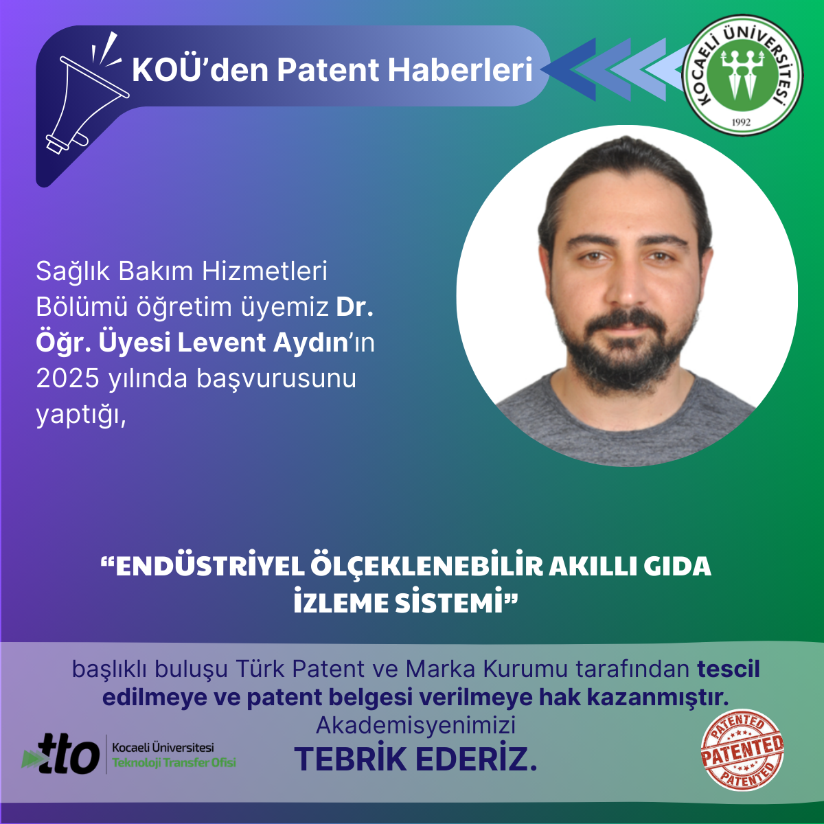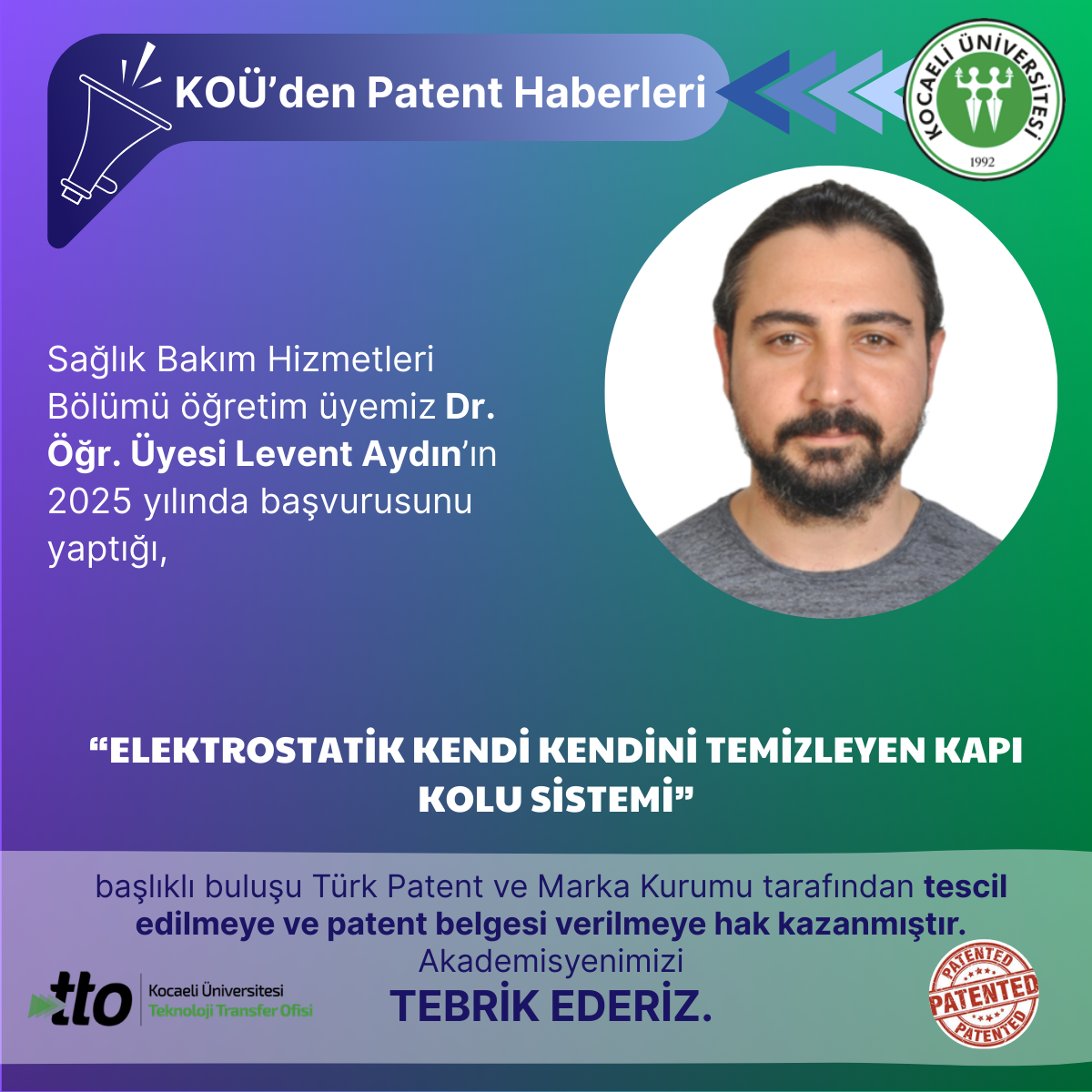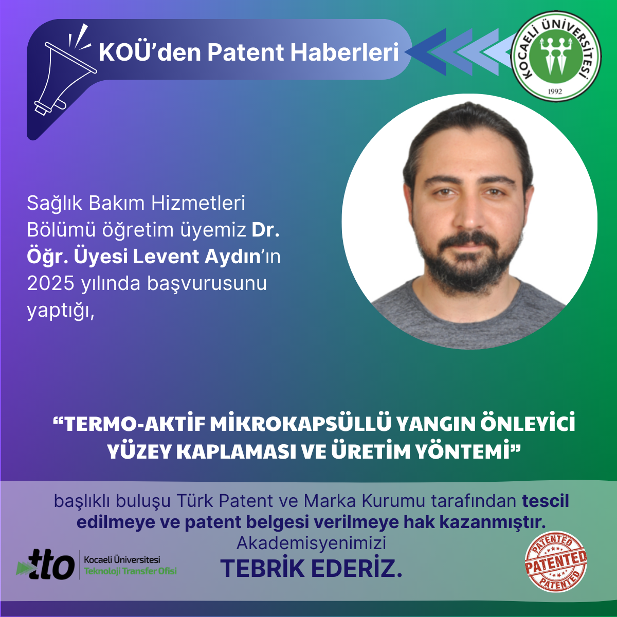 Sağlık Bakım Hizmetleri Bölümü öğretim üyemiz Dr. Öğr. Üyesi Levent Aydın’ın 2025 yılında başvurusunu yaptığı,"TERMO-AKT...