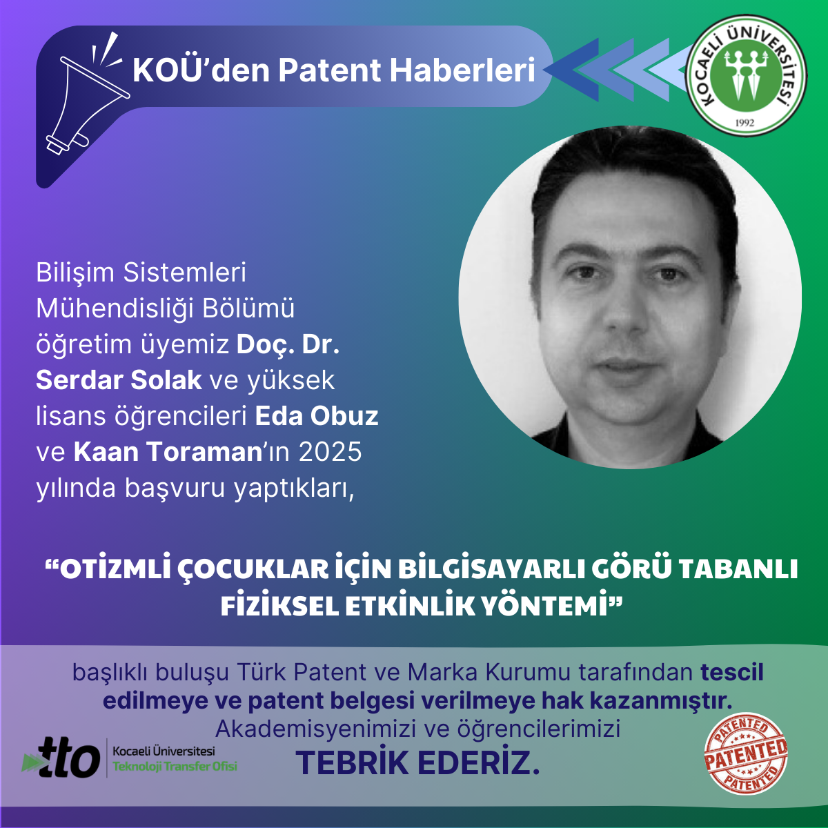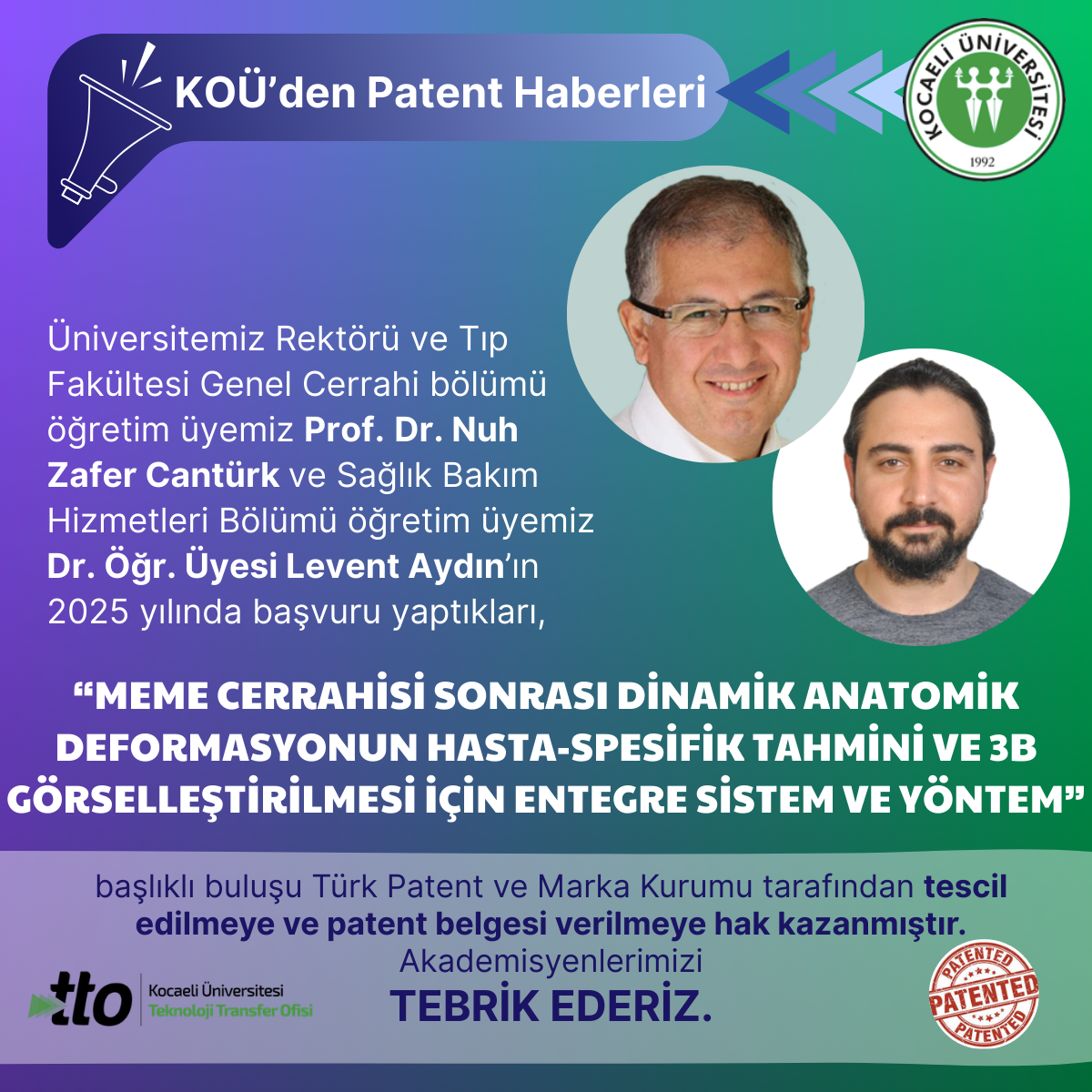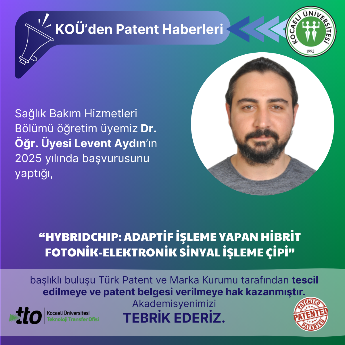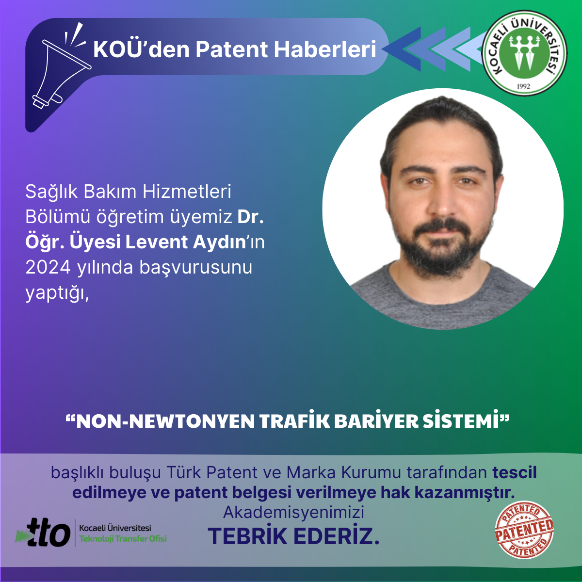 Sağlık Bakım Hizmetleri Bölümü öğretim üyemiz Dr. Öğr. Üyesi Levent Aydın’ın 2025 yılında başvurusunu yaptığı,"TERMO-AKT...