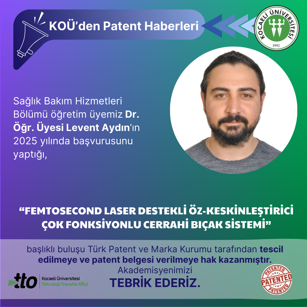 Sağlık Bakım Hizmetleri Bölümü öğretim üyemiz Dr. Öğr. Üyesi Levent Aydın’ın 2025 yılında başvurusunu yaptığı,"FEMTOSECO...